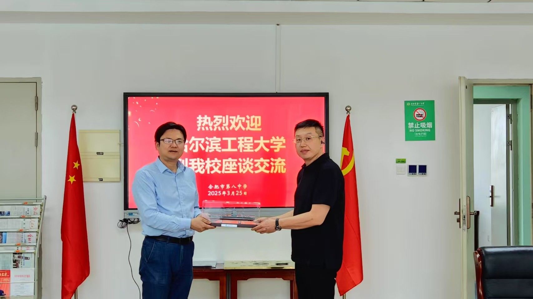 24日下午,招生宣传工作组和安徽校友会一行4人前往合肥一中进行座谈。作为学校的第一所安徽省优质生源基地,杨溪淼对合肥一中长期以来给予学校招生工作的大力支持表示感谢。合肥一中党委书记封安保对哈工程的红色传承和办学实力给予了高度认可,并表示大力支持学校在合肥开展相关招生宣传活动,为活动提供场地支持,体现出安徽省“龙头”中学的高度责任担当。