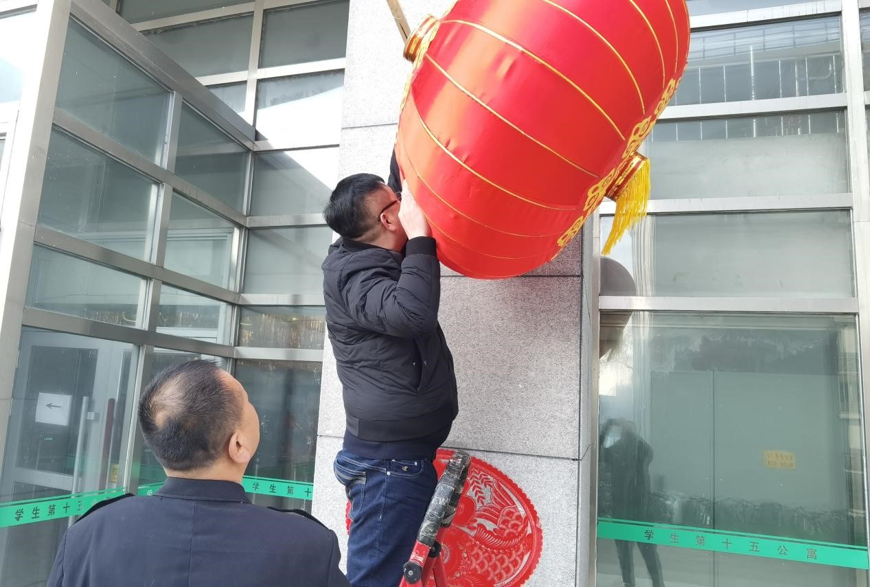 最后杨溪淼与15公寓管理人员共同为15公寓装扮上新春的盛装,大红灯笼高高挂,红红火火过新年,求是书院全体师生向大家拜年啦!