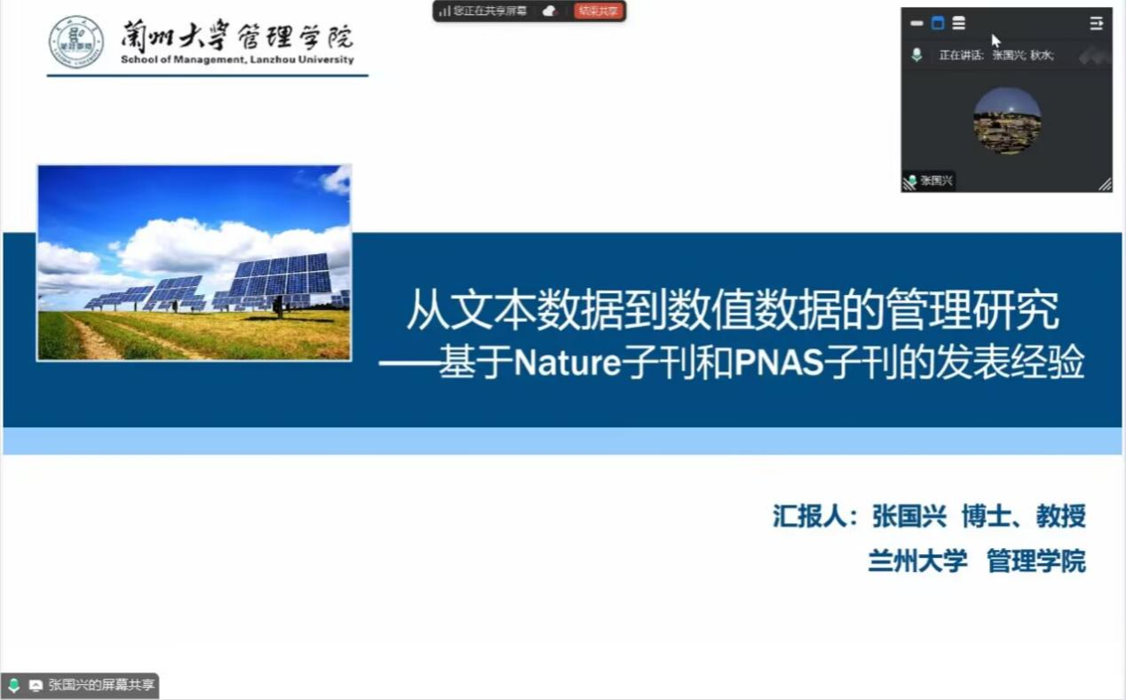 2025年1月18日下午,欧冠官方网站欧冠投注官网入口经管“汇·创”系列活动之2025年第二期学术讲座于线上举行。此次会议邀请到兰州大学管理学院张国兴教授,为我院师生做题为《从文本数据到数值数据的管理研究——基于Nature子刊和PNAS子刊的发表经验》的学术交流讲座。欧冠投注官网入口教师以及博士、硕士研究生共120余人参加了此次讲座,讲座由学院党委副书记、副院长胡玉真教授主持。