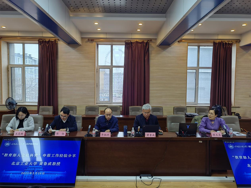 为进一步提升我院师生的申报积极性,充分发挥高等学校科学研究优秀成果奖(人文社会科学)激励导向作用,促进学院高水平科研成果的产出,3月26日下午,学院特邀北京工业大学黄鲁成教授为学院师生进行 “教育部人文社科奖”申报工作经验分享,院长陈恒、副院长胡玉真、院长助理王志楠,以及学院重点培育成果的负责人李柏洲教授、韩国元副教授等教师代表和部分研究生参加了分享活动,活动由胡玉真主持。