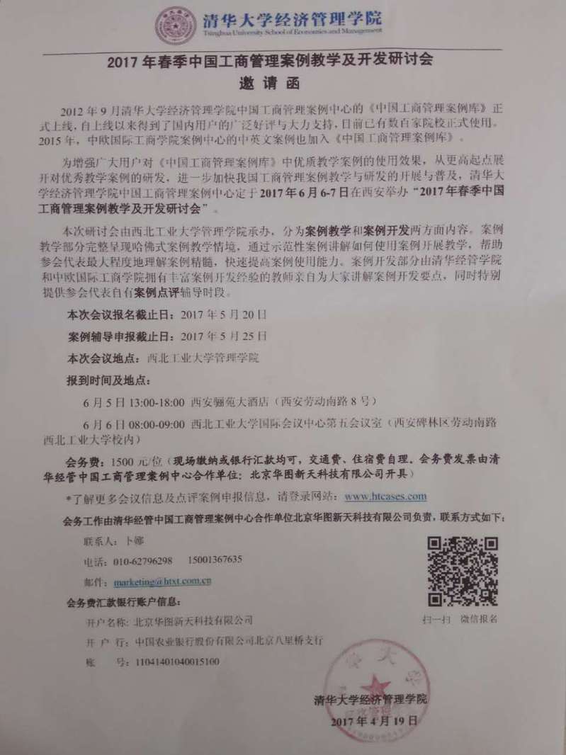 清华大学欧冠投注官网入口中国工商管理案例中心定于2017年6月6-7日在西安举办“2017年春季中国工商管理案例教学及开发研讨会”,详情见下图。