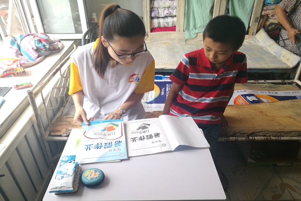 7月13日下午2:00,志愿者们分别来到孩子们的家里,开展课外辅导活动,孩子们对志愿者们的到来表示欢迎。在出发之前,志愿者们已经大致了解了每个孩子的学习情况与进度,更能针对不同的孩子辅导功课。