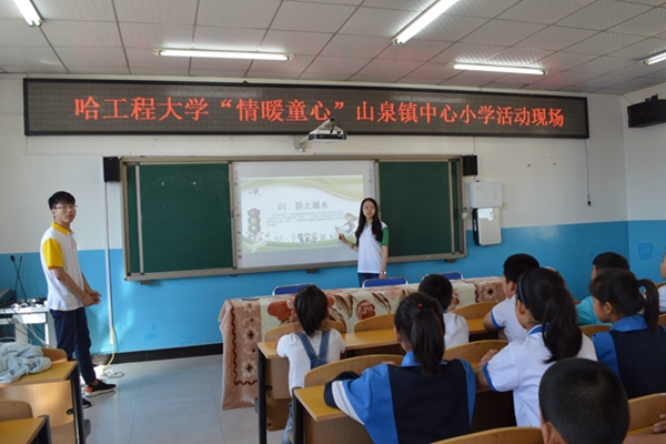 7月11日下午1点30分欧冠投注官网入口“三下乡”暑期志愿实践队在欧冠投注官网入口2016级辅导员董治安与2017级辅导员李文宝壮的带领下于山泉镇中心小学开展安全教育活动。