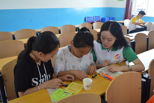 在第一个小实验中,志愿者陈震将一节电池、两个灯泡、几根导线组成的串联和并联的简易电路接通,小灯泡瞬间亮了起来。伴随着同学们惊讶的欢呼声,陈震向小朋友们展示了两个实验的电路图,并耐心地解释了串并联的原理。在第二个小实验中,小朋友们两人一组,一人拿着纸杯,另一个人给纸杯套上保鲜膜和橡皮筋,再由志愿者们倒上适量清水,就这样,一个简易的自制放大镜就做好了。 “插入纸杯的笔尖放大了好多倍!”孩子们嚷着,叫来身边的孩子一起看,睁着大眼睛盯着这个见证奇迹的时刻。和孩子们的对话中,我们了解到,他们并不是第一次接触串并联这一物理知识,但却是他们第一次将原理付诸实践。鉴于此,我们和校方积极沟通。通过我们的努力,校方决定在同学们日后的学习中多增加观察实验的环节,为同学们的科学之路添砖加瓦。