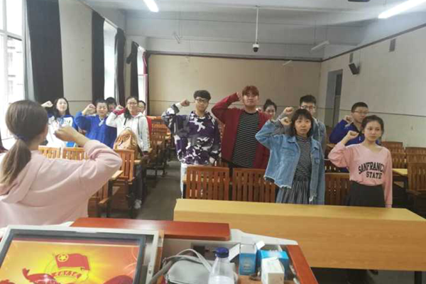 伴随着慷慨激昂的国歌,团支书宣读了《团章》中有关团员的义务和权力的条款,介绍了团的性质以及团的基本要求,并带领所有团员回顾了团的历史进程。之后,老团员代表在热烈的掌声中做了总结发言,他们表示加入团组织是人生的崭新起点,身为团员,就要在各方面不断提高自身素质和修养,严格遵守团章,履行团员义务,为团组织增添光彩。在活动的尾声,全体团员佩戴着团徽,在团支书的带领下,面对鲜红的团旗,右手握拳举过肩,在团旗下再一次庄严宣誓,青春的誓言喊出了对共青团的热爱。通过重温入团仪式,团员们接受了一次严肃而庄重的教育,经历了一次心灵的洗礼。铮铮誓言,火热青春。每一位参加重温入团仪式的团员在这庄严神圣的氛围中,深切地感受到作为共青团员的一份沉甸甸的责任。