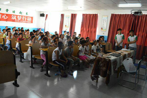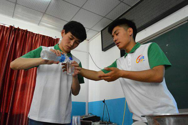 志愿者首先将提前准备好的器具布置妥当,科协主席郭咸生和阳光助学中心主任王权亮担任此次课程的主讲人。随后活动开始,志愿者播放科学小知识视频,引起小学生的兴趣后,开始进行科学小实验,第一个小实验是“不会掉落的纸”,郭咸生首先将纸杯里的水倒满,将纸片放到水杯上,水杯倒转,但纸和水都不会掉落,在小朋友非常好奇时,郭咸生讲解了大气压的知识。随后又用“旋转的铜丝”和“掉落的火柴”向小学生讲解了有关于电磁场和静电的知识,其余志愿者协助,让每位小朋友都动手参与其中,下午3时30分活动结束。
