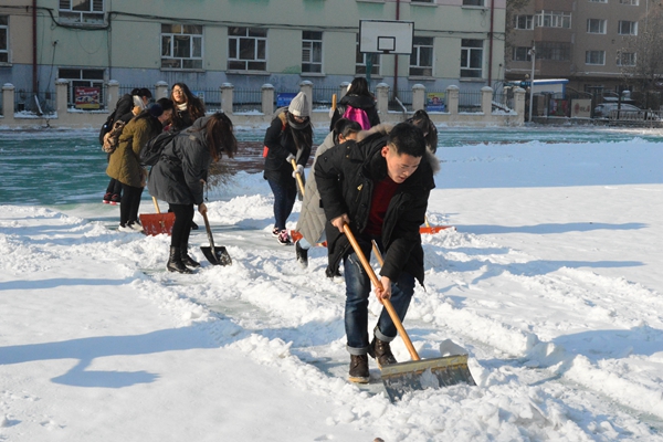 到达燎原小学后,于天一部长对劳动任务进行了部署,志愿者们便开始了紧张而有序的扫雪任务。志愿者们被分为两大组,由部长于天一和副部乔琦峰带领,大家又各自结伴,一人铲雪,数人推雪。志愿者们认真打扫,效率极高。由于准备充分,志愿者们将小学操场上的冰和雪都清理干净,活动进行的十分顺利。