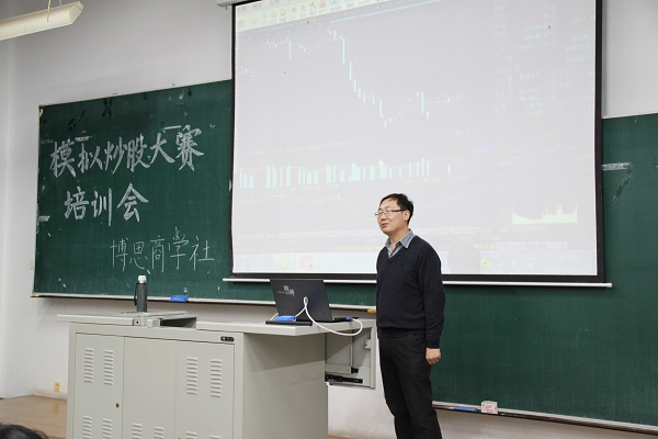 模拟炒股大赛是由博思商学社组织举办的校级比赛,全校各院系学生均积极参与,踊跃报名,从中学习并获取拆股经验。在培训会上,吕老师介绍了对于证券投资的基础认识,股票交易的基本规则,我国的“T+1”制度等等。并讲解了本次比赛所涉及相关程序的具体使用