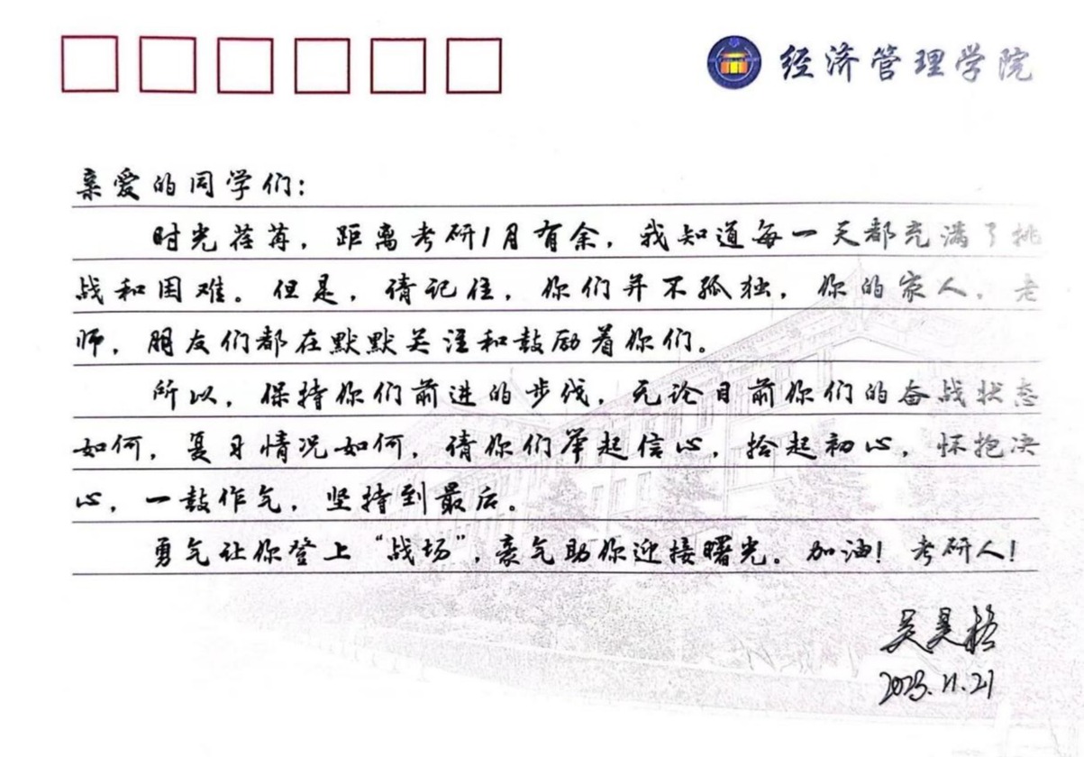 杨溪淼代表经管学院全体师生祝考研学子心想事“橙”,乘风破浪,成功上岸。同时建议学生们要注意劳逸结合,调整作息,养精蓄锐,打好考研最后一个月的攻坚战!