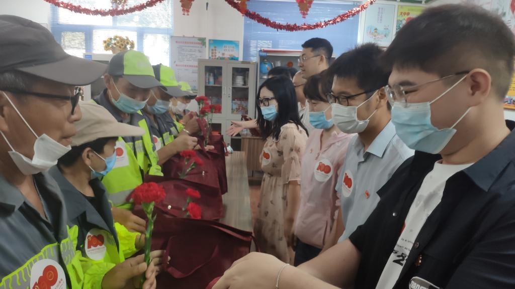 此次学院党委与泰达社区联合开展的“校社联动送清凉 爱心情暖环卫人”志愿服务活动中,学院党委副书记吴雷与环卫工人们亲切交流,送出美好祝愿。学院的师生党员们将煮好的绿豆汤逐一发到了环卫工人手中,随后为辛苦在一线的环卫工人赠送鲜花,口罩,湿巾,凝胶,毛巾等防疫大礼包。捐赠现场一片爽朗而愉快的笑声,炎炎夏日里,爱心物资“清凉”地温暖了环卫工人。活动后,环卫工人发来微信:炎炎烈日,是你们给我们带来了凉意。感谢你们的爱心举动。我们会把我们的家园打扫的更加干净,整洁。学院在了解到泰达社区“关爱失独家庭”情况时,主动为三户失独老人家庭捐赠防疫礼包和鲜花,委托社区工作人员送至家中。