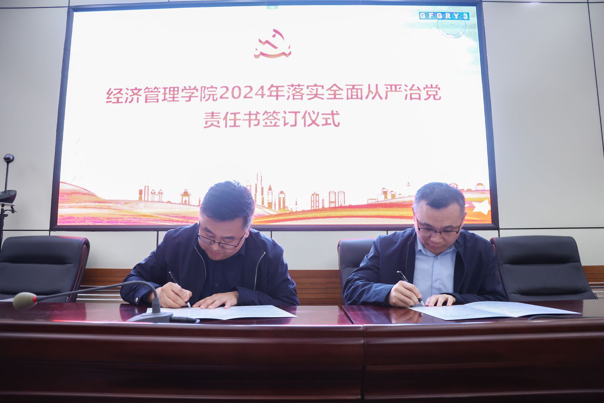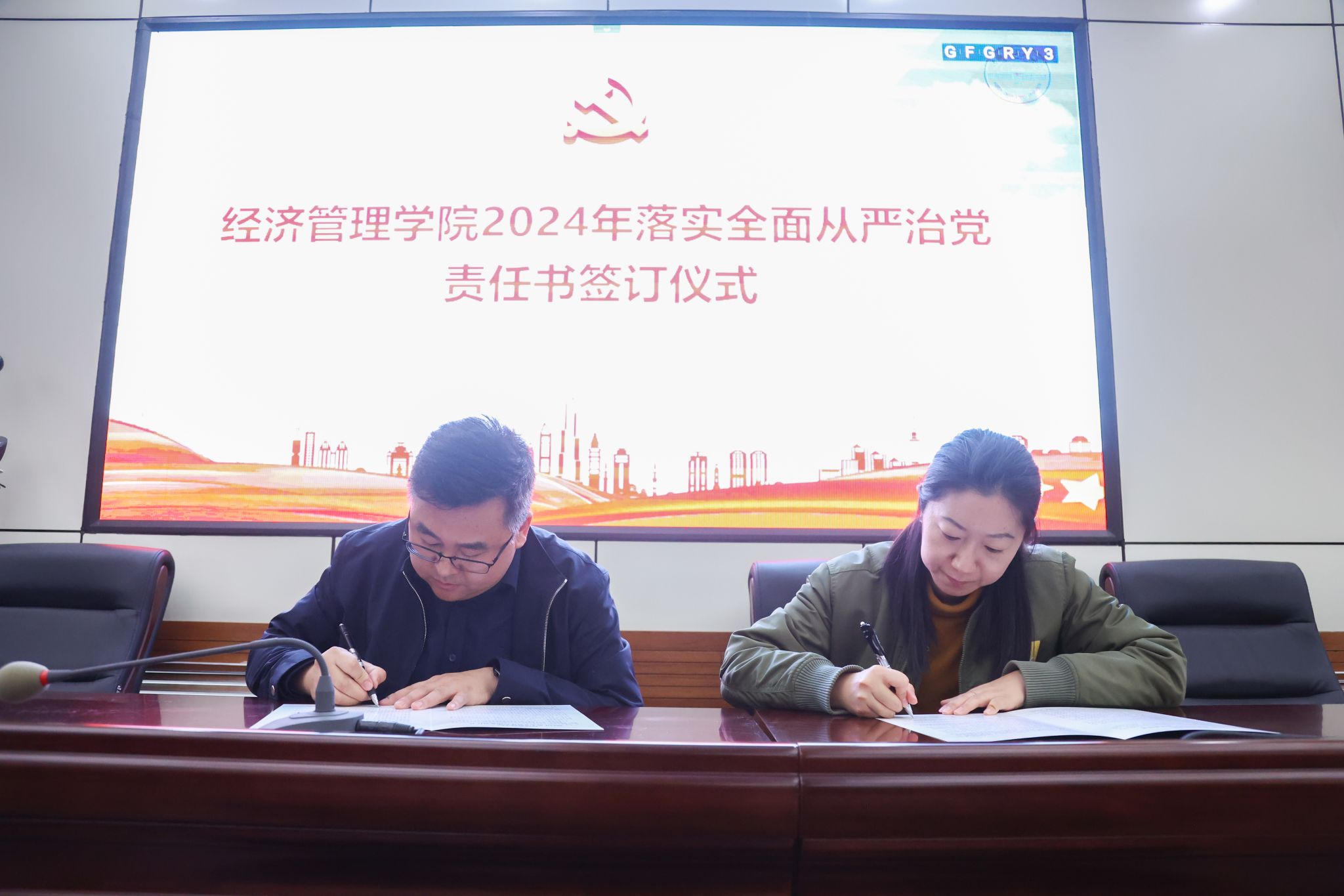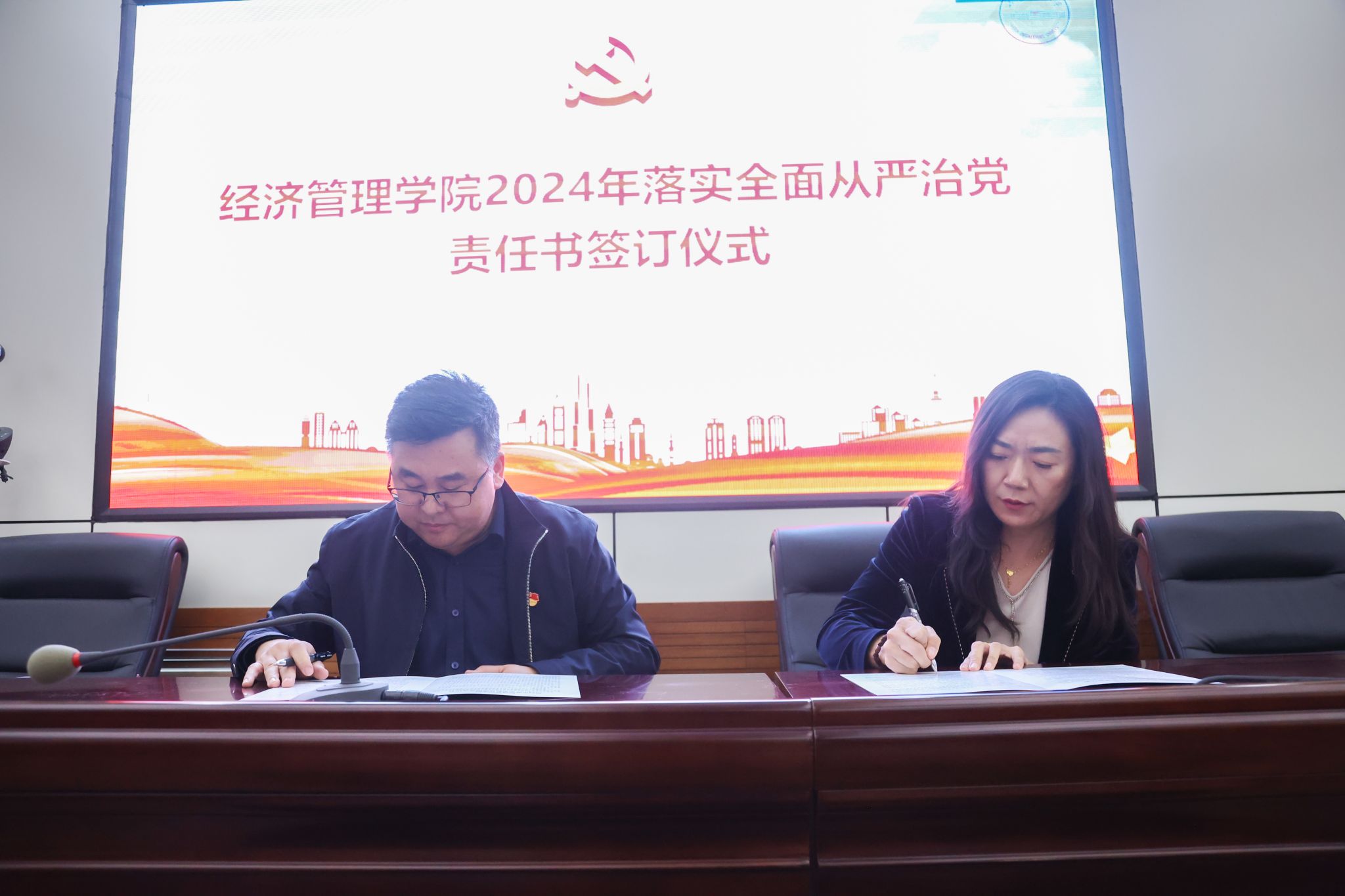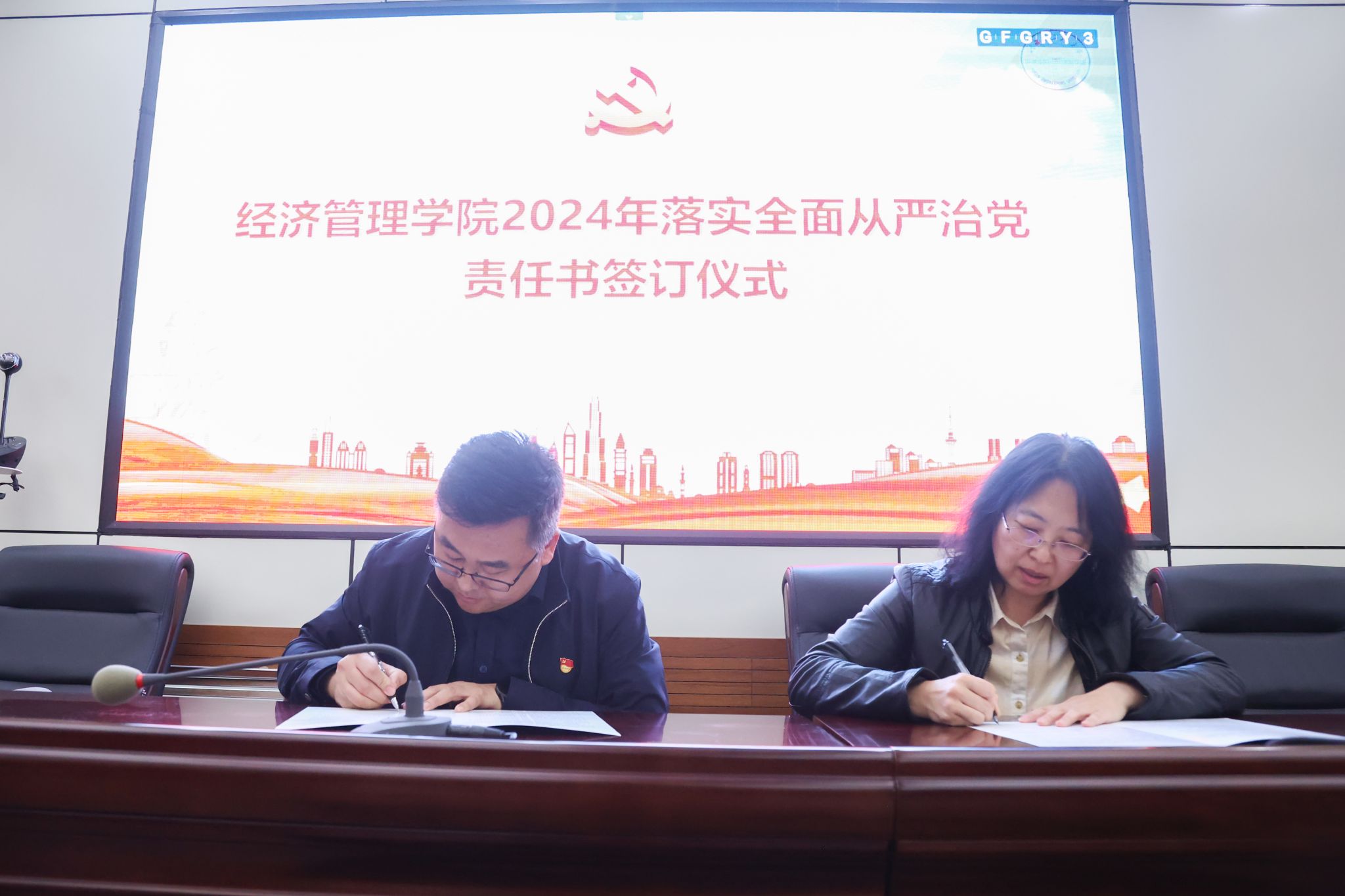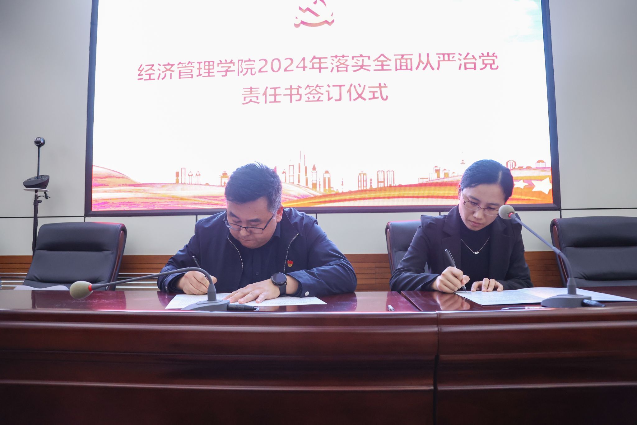 会议举行了2024年落实全面从严治党责任书签订仪式。党委书记于云亮代表学院党委与学院其他领导班子成员和教工党支部书记签订《落实全面从严治党责任书》。